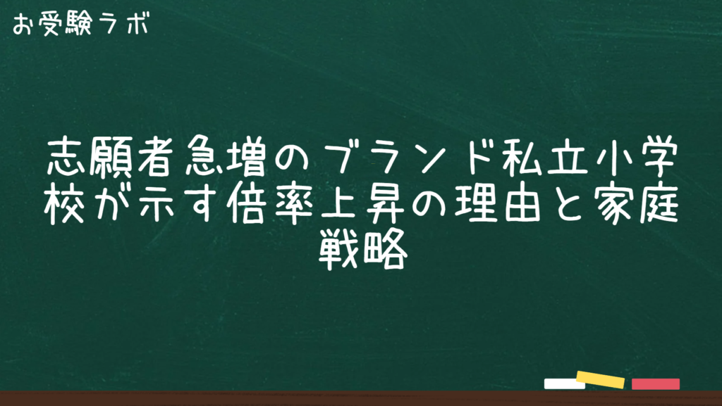 お受験ラボ編集部です。小学校受験を控えたあなたにとって、志願者が急増し倍率が上がる“ブランド校”の動向は気になるところでしょう。この記事では、倍率上昇の背景にある学校の特徴や家庭の事情、そして受験戦略について具体的に解説します。私の経験を... -