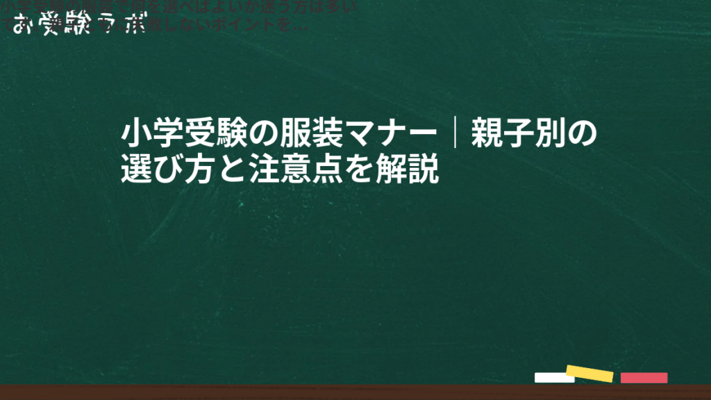 小学受験の服装で何を選べばよいか迷う方は多いです。親子ともに失敗しないポイントを押さえましょう。 小学受験の服装は、学校の指示に沿い、清潔感があり、動きやすいことが大切です。見た目の上品さだけでなく、実際の試験内容に合わせた服装選びが必要... -